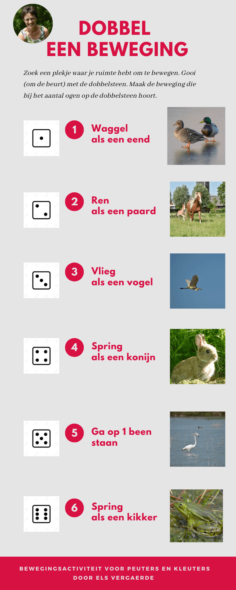 Dobbel met een dobbelsteen en kijk op de download welke beweging daarbij hoort. Je kunt ook zelf de bewegingen bedenken bij het elk getal.